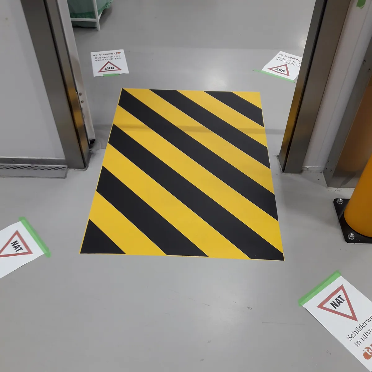 Wij hebben bij Unilever in Wageningen een aantal veiligheidsmarkeringen op grond aangebracht. De reden van deze markering is dat de medewerkers hierdoor kunnen zien waar zij moeten uitkijken en waar geen artikelen geplaatst kunnen worden. Op deze manier wordt er gevaar voorkomen.