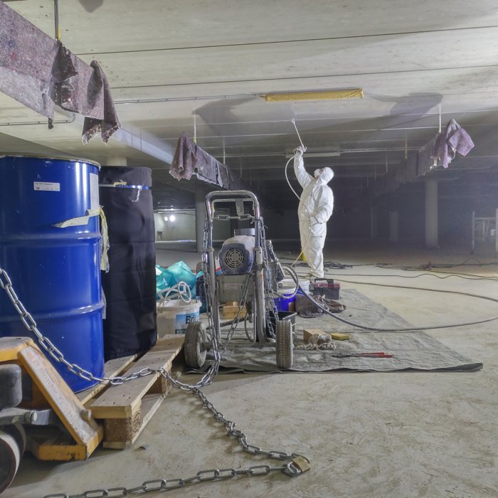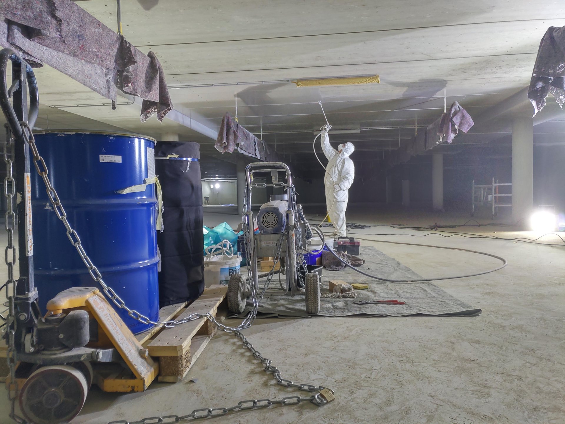 Als voorbereiding wordt het oppervlak eerst gekit en afgeplakt waar nodig. Vervolgens worden de plafonds gespoten met een Airless spuitmachine. Dit is een speciale methode dat goed werkt bij koude en grote oppervlaktes. De verf wordt op temperatuur gebracht door warmtedekens, dit is voor de vatverwarming om de verf op de juiste temperatuur te kunnen spuiten. Door deze methode kunnen grote oppervlakten snel en secuur worden gespoten. In dit geval van het AFAS Experience Center werd er een oppervlakte gespoten van 30.000 m3.