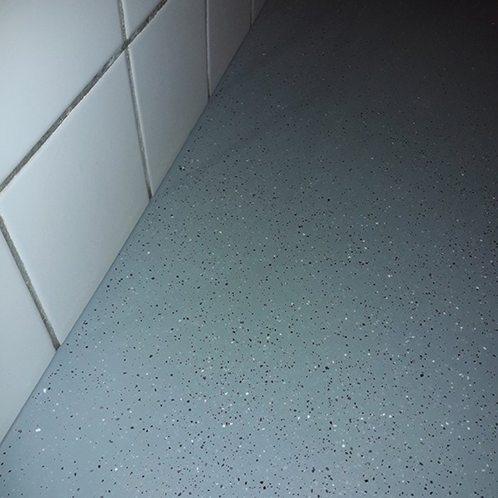 - Nu wordt de gietvloer aangebracht, eventueel kunnen daar decoratieve flakes in worden aangebracht.