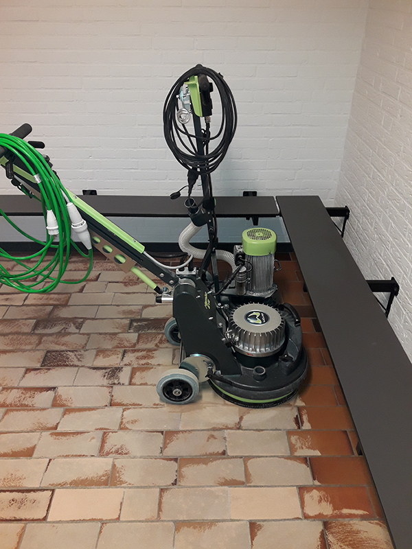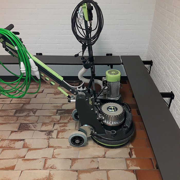 - Ondergrond voorbewerking uitvoeren: door middel van diamant schuren de glazuurlaag van de bestaande tegels schuren.