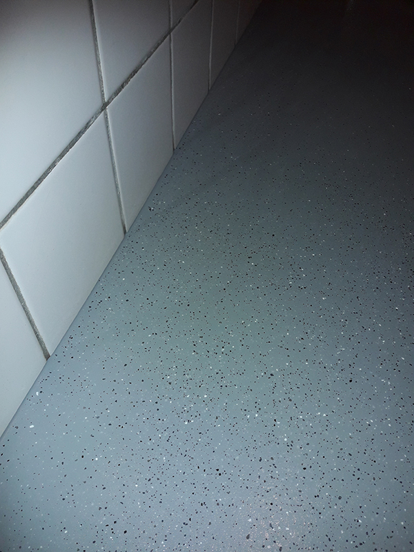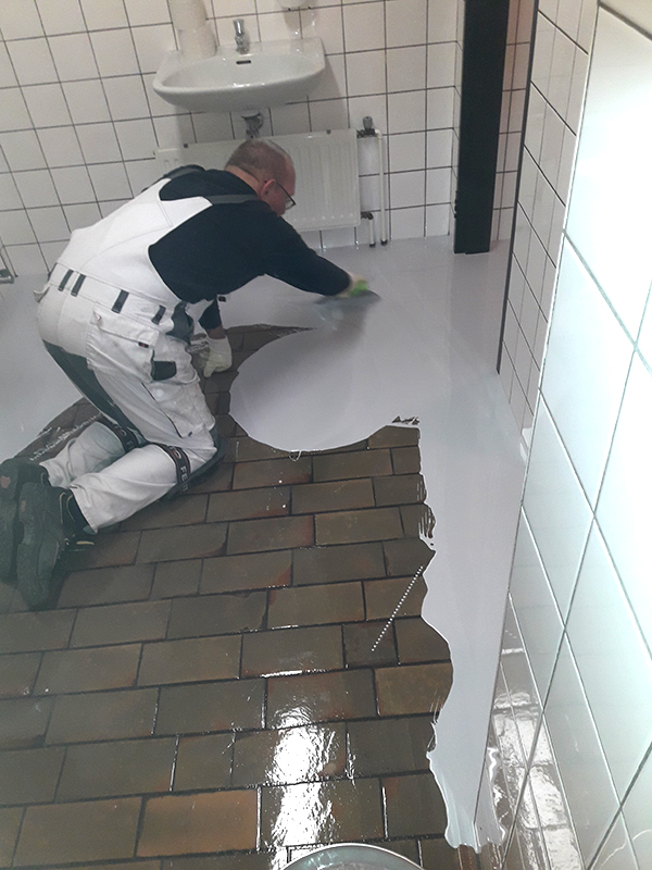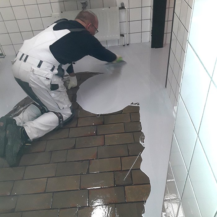 - Nadat de grondlaag droog is wordt er een schraaplaag epoxy primer aangebracht, waarmee onder andere de voegen van de tegels worden weggewerkt.