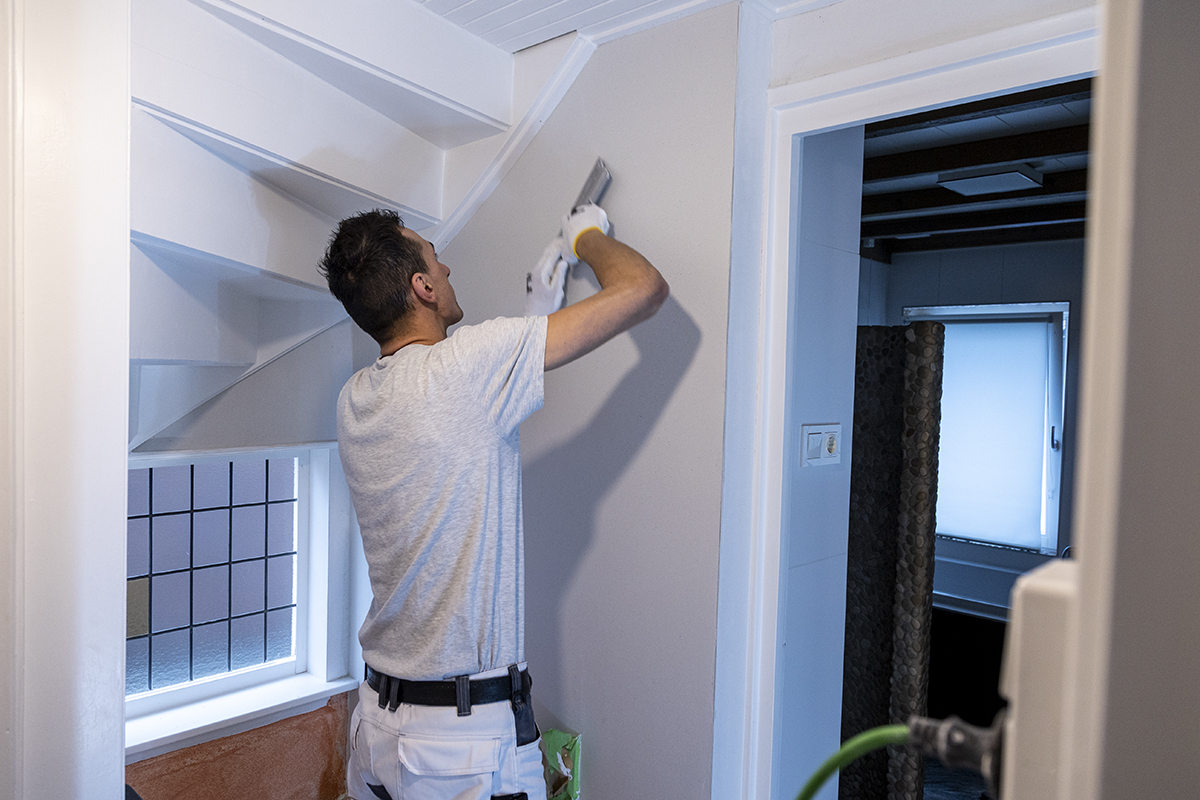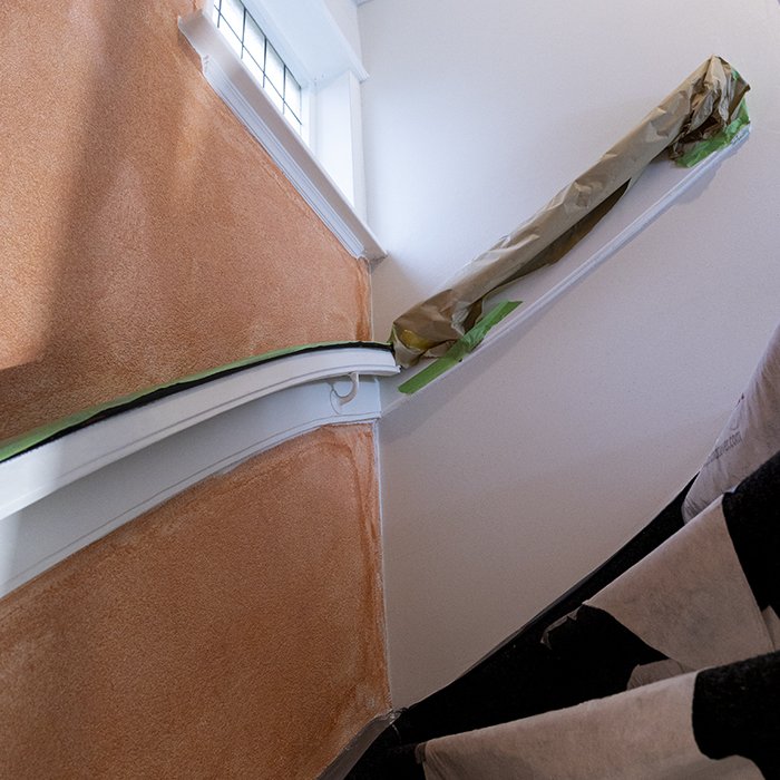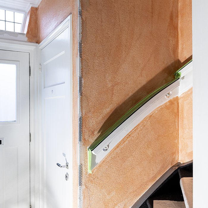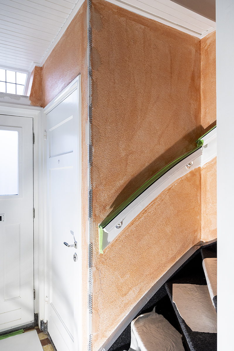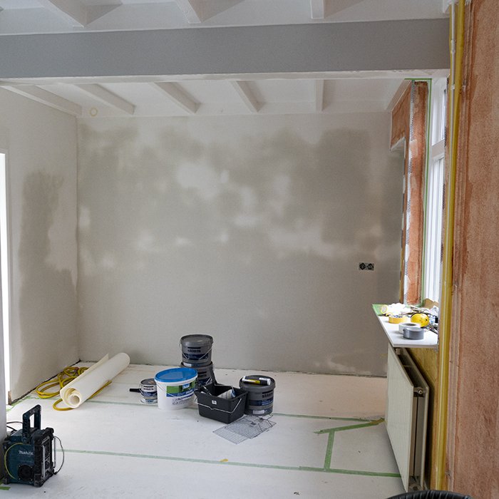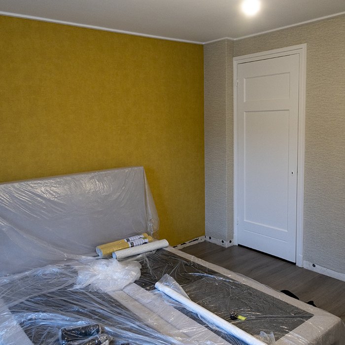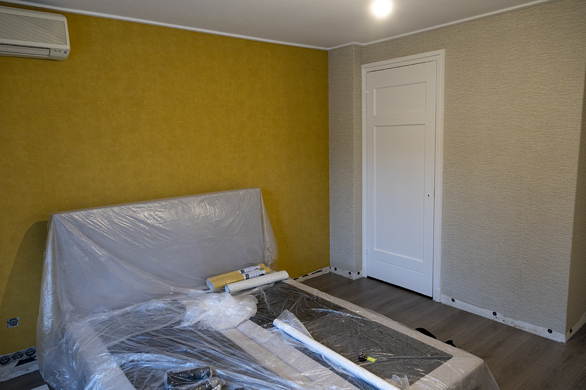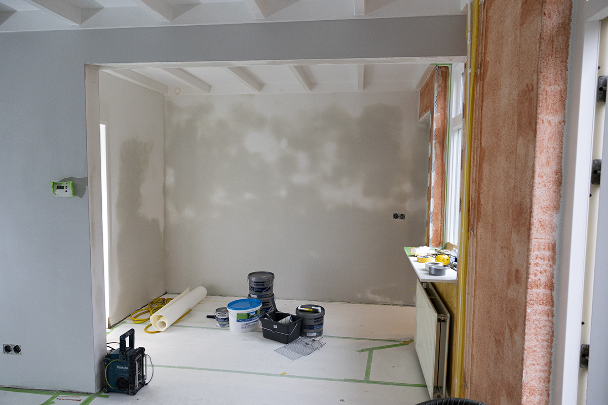 Tijdens het opknappen van de woning zijn we begonnen met het stucwerk in het trappengat en een aantal wanden in de woonkamer. Daarna zijn wij bezig geweest met het sausen van de hal. Op de bovenverdieping hebben wij in de slaapkamer behang aangebracht.
